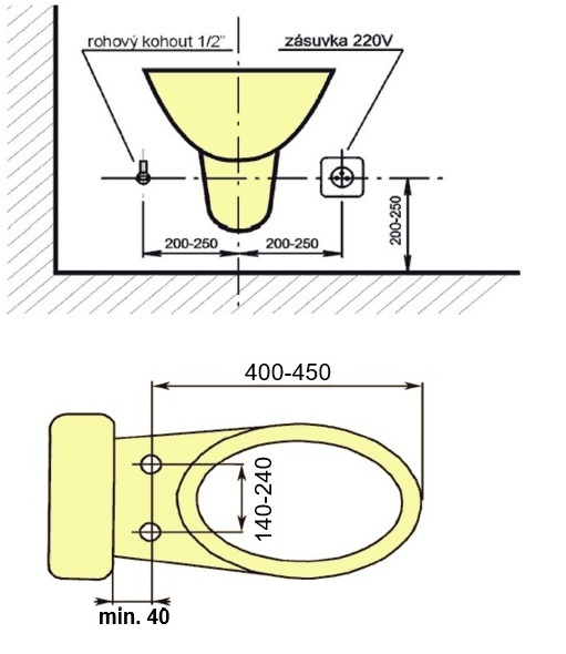 Bidet lze instalovat na Vaši stávající toaletní mísu. Abyste před pořízením bidetu měli úplnou jistotu, že bude vhodný na Vaši stávající toaletní mísu, doporučujeme ověřit, zda rozměry této mísy odpovídají rozměrovému náčrtku. V dosahu 1,5 m od bidetu je nutno umístit zásuvku 230V/50Hz.